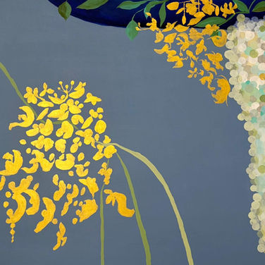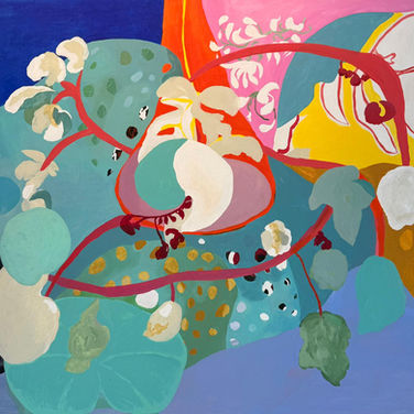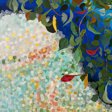 Nesse conjunto de trabalhos, o plano pictórico deixa de ser um espaço de recorte para se tornar um ambiente contínuo. Diferentemente de produções anteriores, em que áreas de vazio e a justaposição de elementos tinham papel estruturante, aqui a superfície se adensa. As profundidades não são construídas por perspectiva, mas pela sobreposição de camadas, pela vibração da cor, pela convivência entre transparências e opacidades. A imagem não se impõe sobre a tela, mas parece emergir dela.